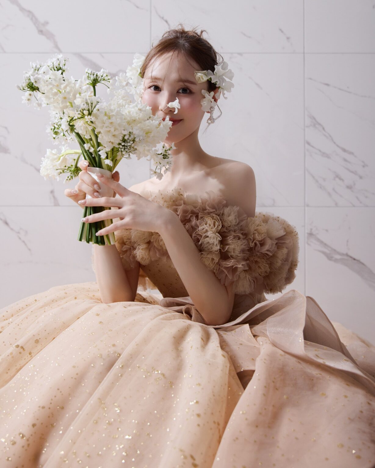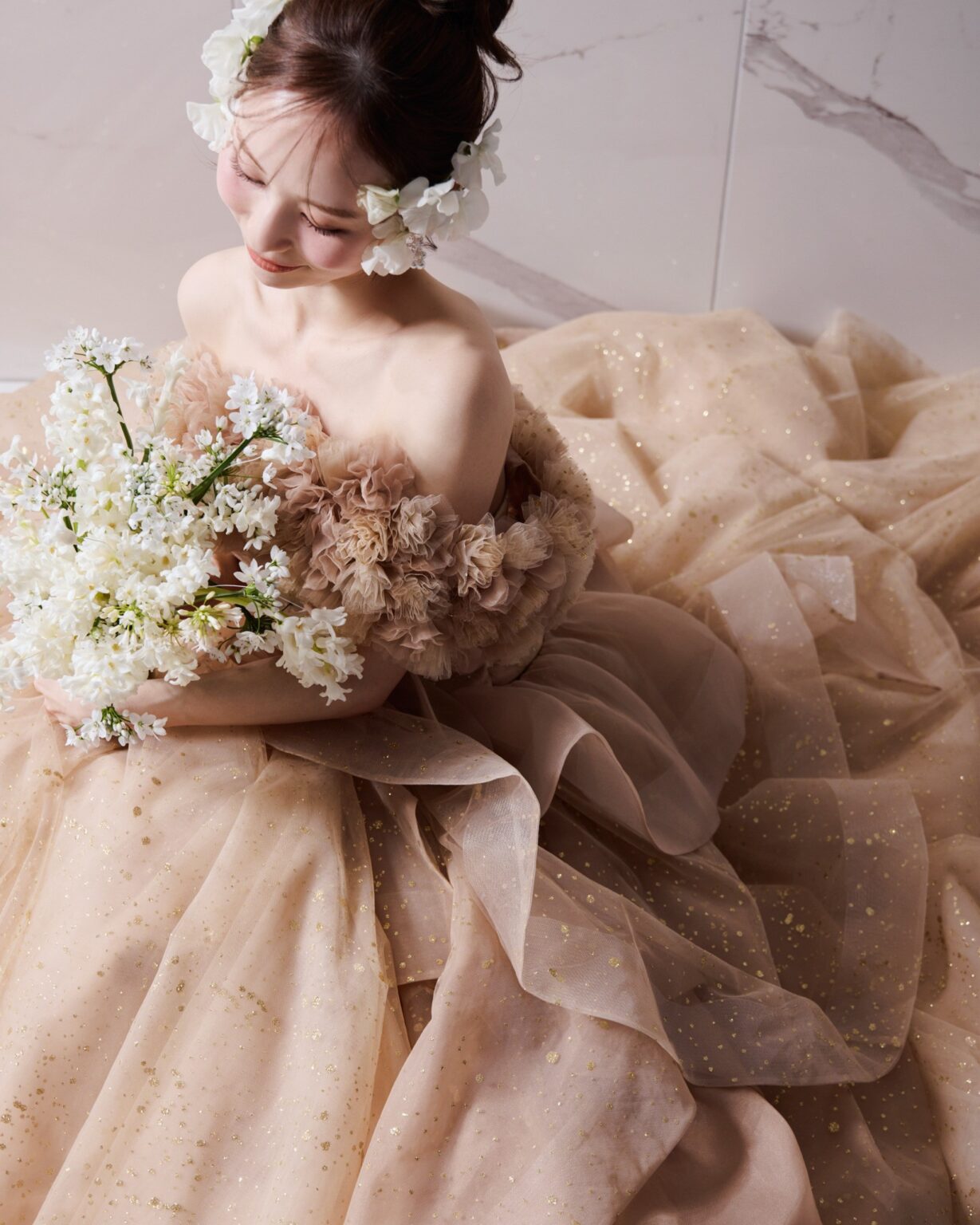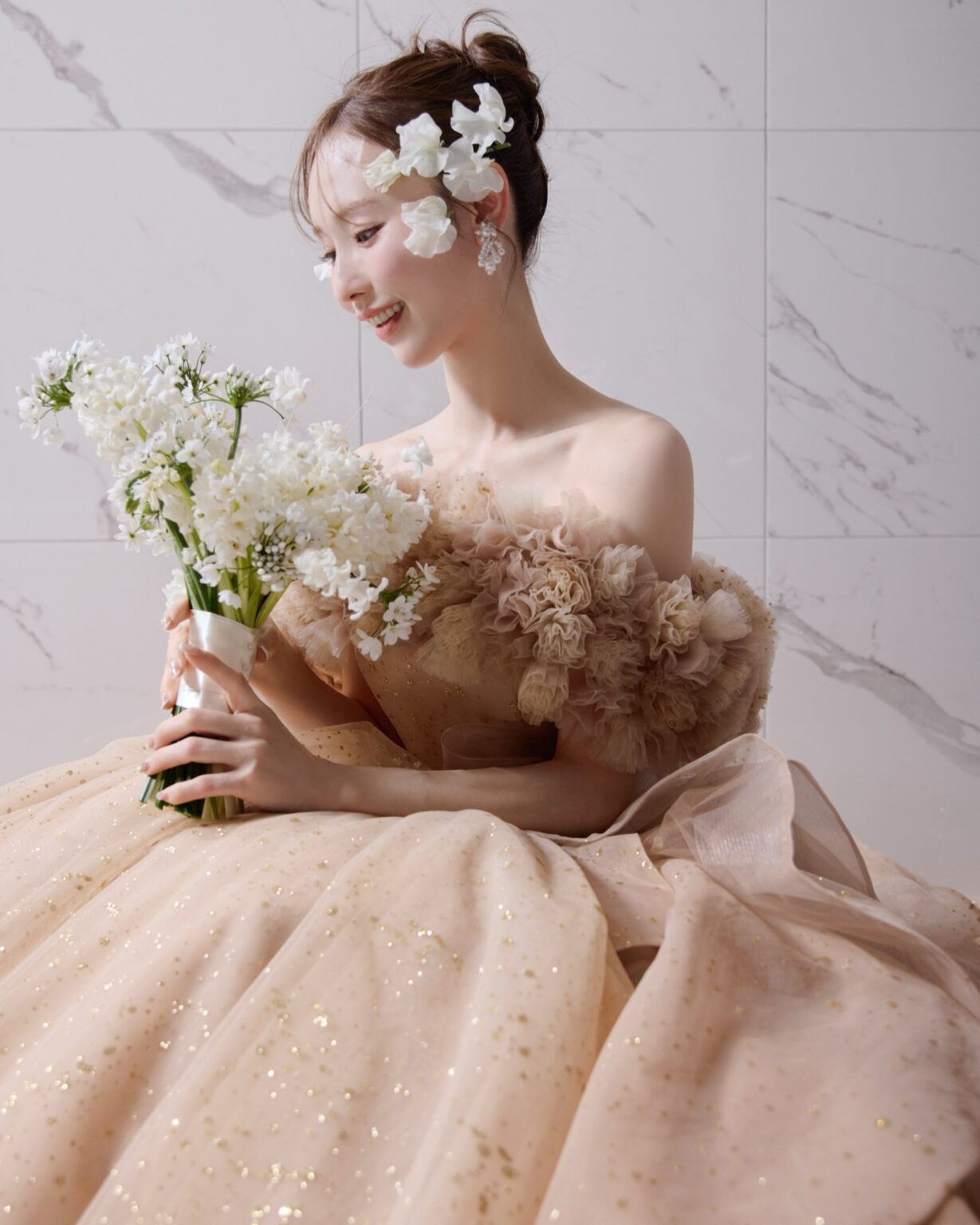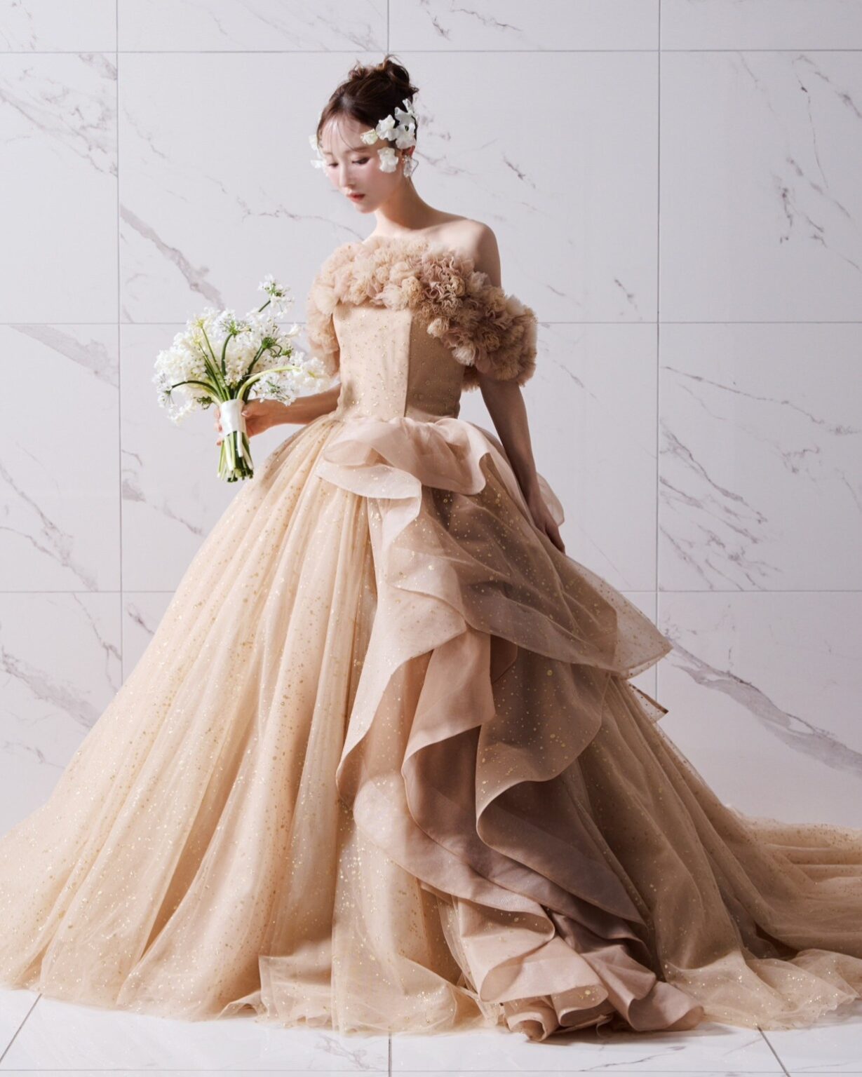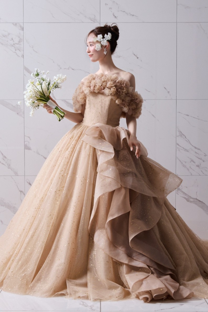 サテンのロールカラーが放つ上品で凛とした佇まいと、華やかな3Dフラワー・オフショルダー、2種類のショルダーデザインを楽しめる贅沢な一着。 纏う人の希望に合わせて表情を変えられる、マルチWAY仕様のドレスです。 サテンのロールカラーは花嫁のネックラインに合わせて美しくフィットさせることができます。 スカートには、華やかさと輝きのバランスにこだわって仕上げたゴールドのオリジナルグリッターチュールを使用。 光の表情にこだわり、グリッターの粒のサイズから決め、さらに何度も煌めきのバランスを調整しました。 取り外し可能なラッフルパーツも同様に仕上げており、スカート部分のホースヘアがドラマティックな立体感と動きを演出します。 ご希望のテイストに合わせてご自身らしいコーディネートをお楽しみください。